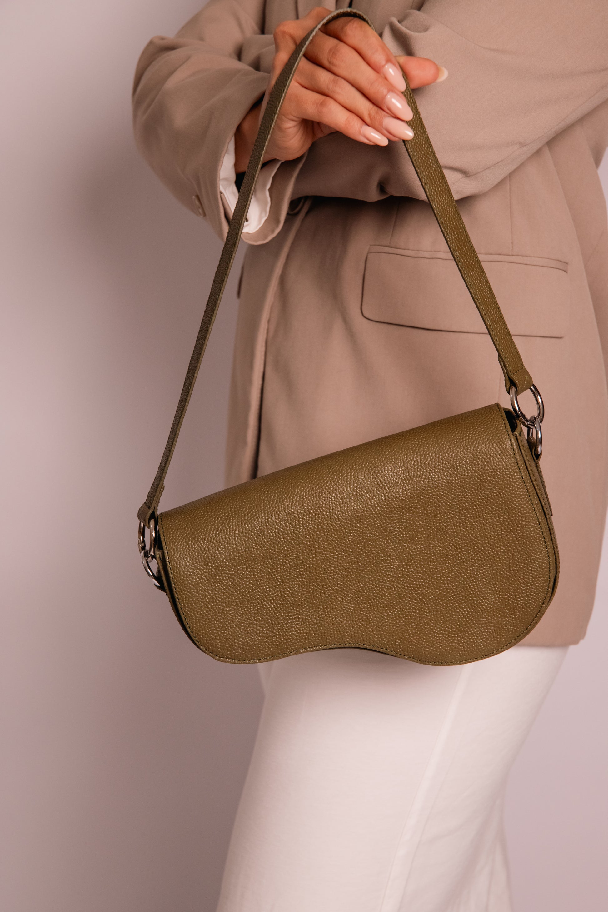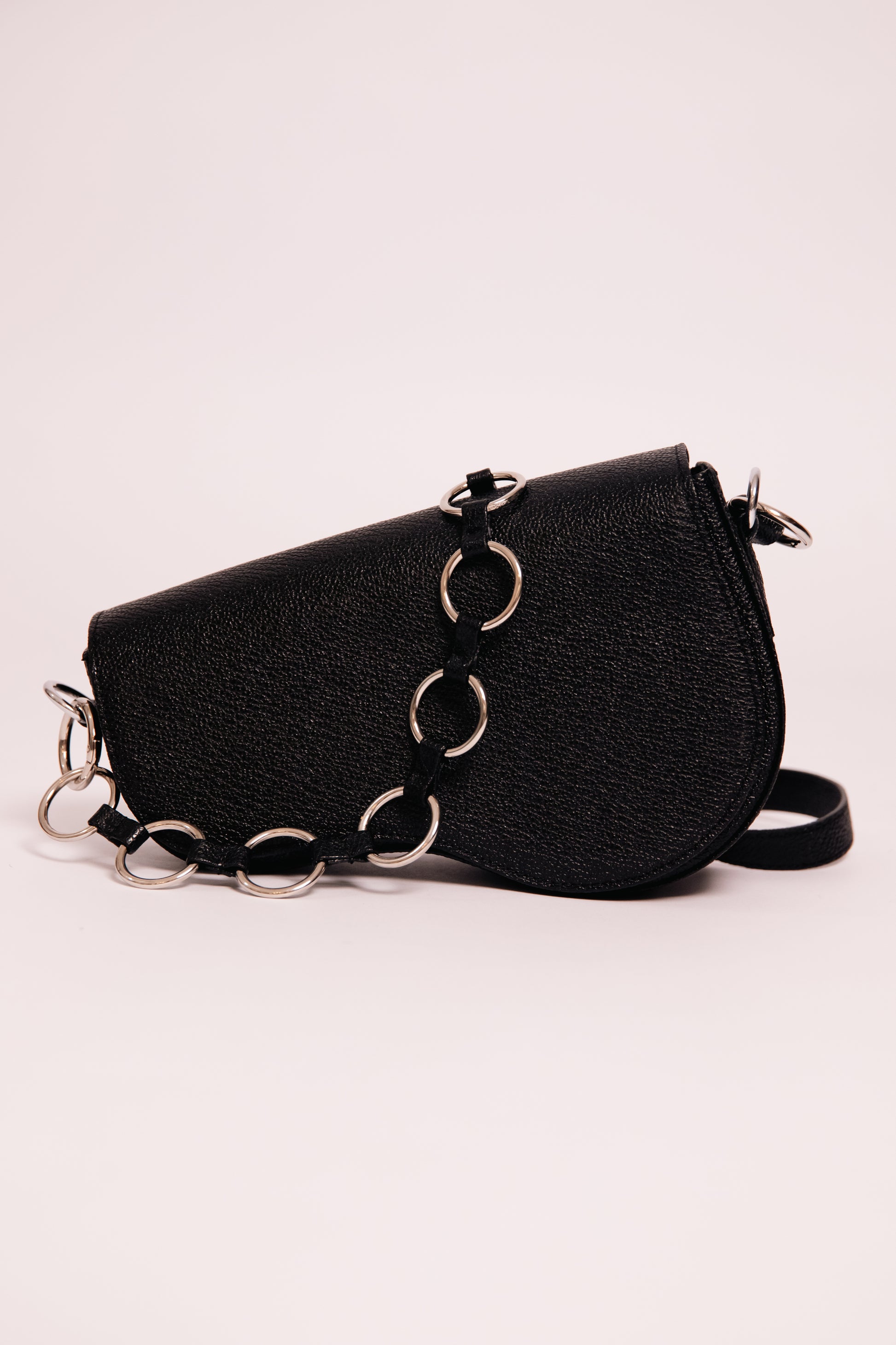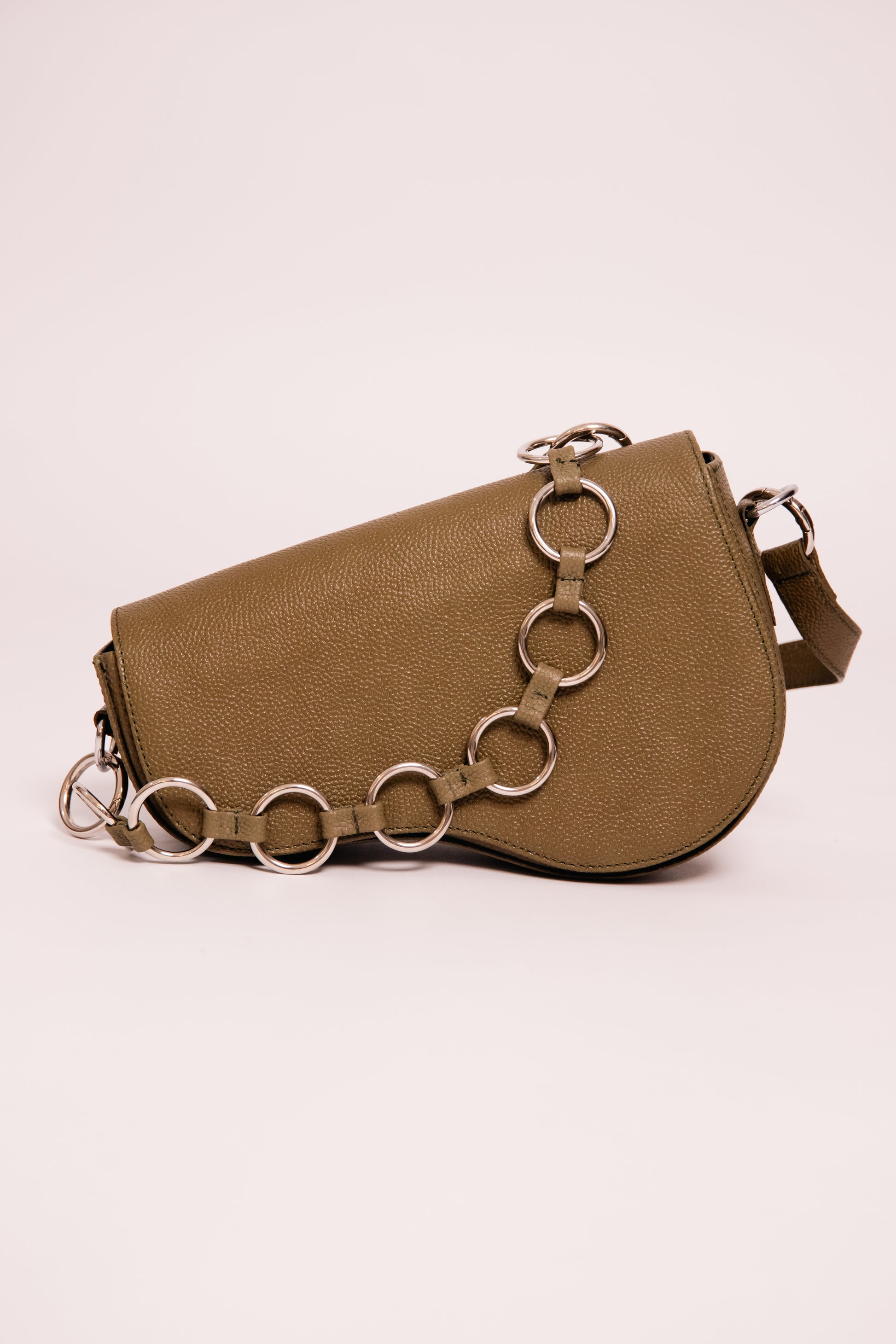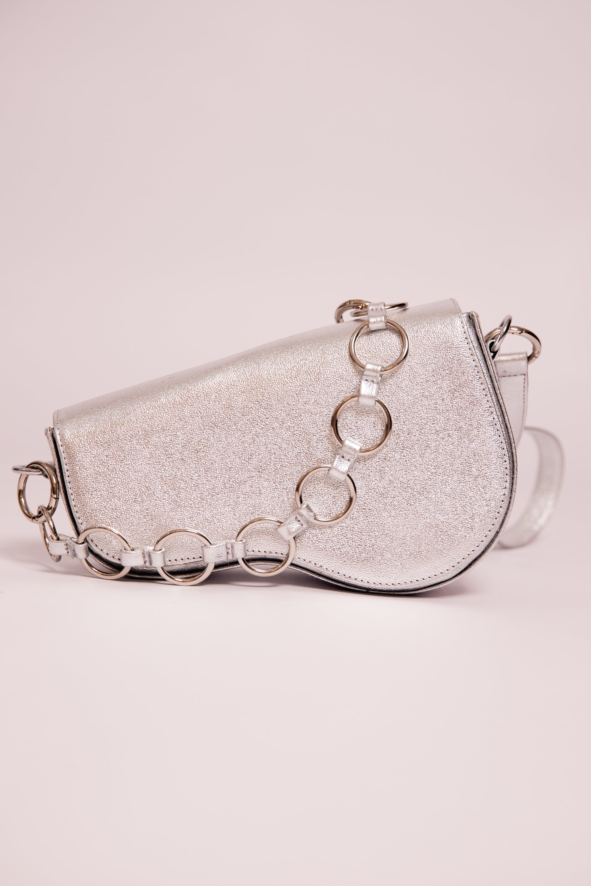 Bolso Origen refleja en su silueta irregular el ADN de la marca: versatilidad, autenticidad y calma. La tapa con imán resguarda lo esencial, mientras que la correa graduable permite llevarlo cruzado, al hombro o en la mano. Su correa combina tramos lisos y un tejido tipo cadena formado completamente por eslabones con uniones en cuero, creando un juego de texturas que celebra el detalle hecho con alma.